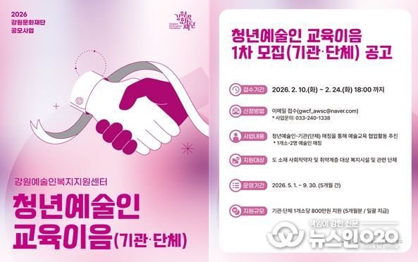 (뉴스인020 = 김성길 기자) 강원문화재단은 도내 청년예술인의 안정적인 활동 기반을 조성하고 문화예술의 사회적 가치를 확산하기 위해 '2026년 청년예술인 교육이음 사업' 공모를 추진한다.