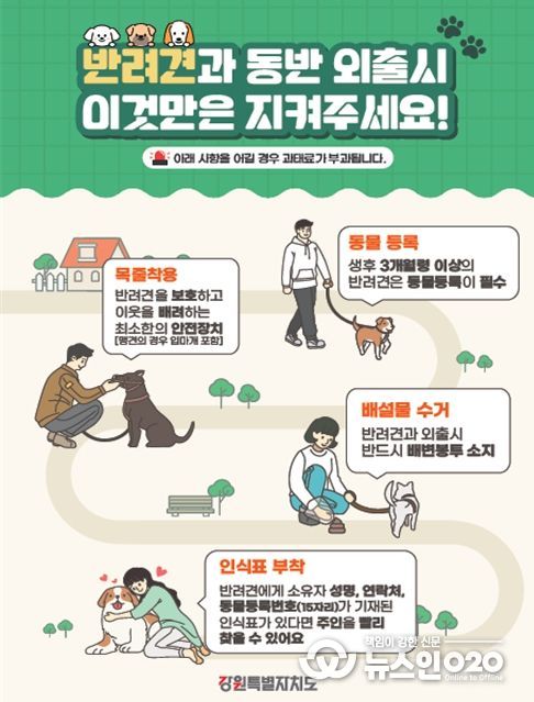 또한 반려동물 동행 캠페인은 18개 시군, 강원특별자치도수의사회 등과 협력하여, 역, 터미널, 전통시장, 대형마트 등 반려인들이 자주 왕래하는 장소에 현수막 게시, 포스터 부착 등을 통해 진행하며, 외출 시 목줄, 가슴줄(2미터 이하) 및 인식표 착용, 배변봉투 챙기기 등에 대해 집중 홍보할 계획이다.