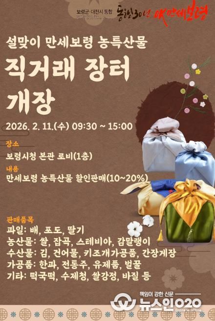 (뉴스인020 = 김성길 기자) 보령시는 설을 맞아 오는 11일 오전 9시 30분부터 오후 3시까지 보령시청 본관 1층 로비에서 ‘2026년 설맞이 만세보령 농특산물 직거래장터’를 운영한다고 밝혔다.
