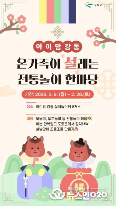 (뉴스인020 = 김성길 기자) 서울 강동구는 다가오는 설 명절을 맞아 관내 ‘아이맘 강동’ 8개소 실내놀이터에서 아이와 가족이 함께 즐길 수 있는 전통문화 체험 프로그램을 운영한다고 10일 밝혔다.