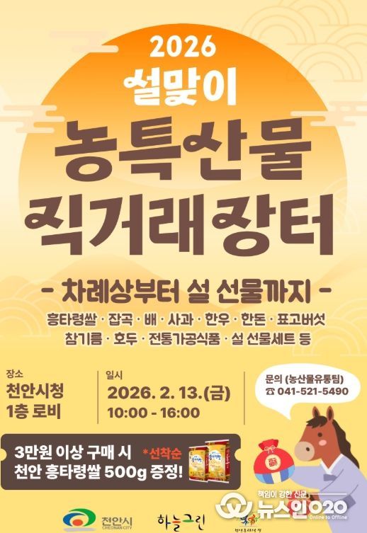(뉴스인020 = 김성길 기자) 천안시는 오는 13일 천안시청 1층 로비에서 ‘설맞이 농특산물 직거래장터’를 연다고 10일 밝혔다.