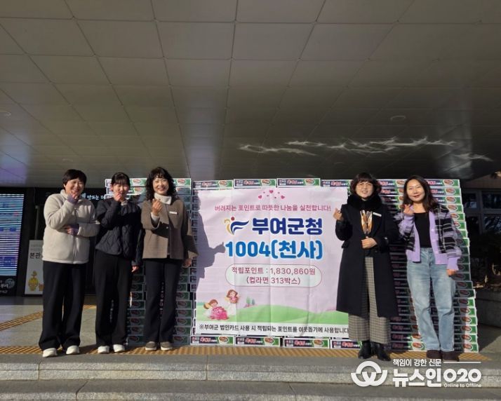 부여군청 관계자는 “버려지는 적립포인트를 모아 이웃사랑을 실천하는 ‘1004 나눔’ 사업이 더욱 확산할 수 있도록 전 부서에 지속적으로 홍보하고, 군민이 체감할 수 있는 복지 실현에 앞장서겠다.”라고 밝혔다.