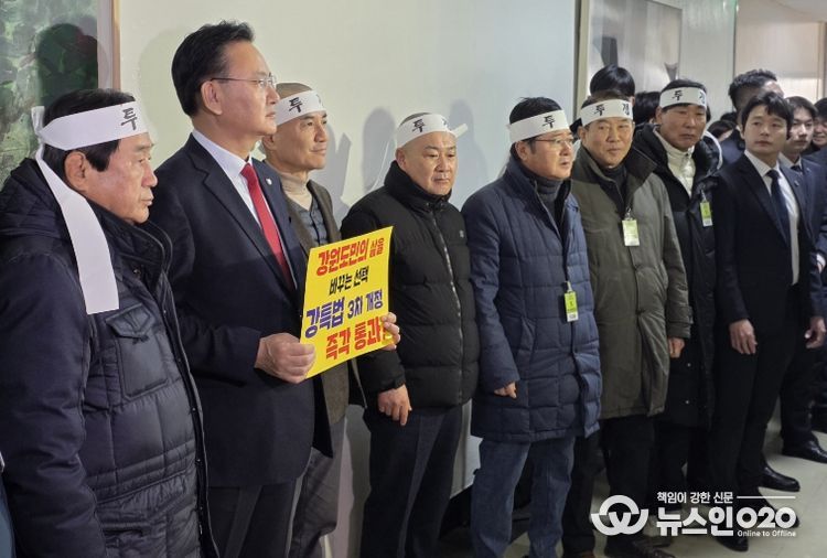 이 자리에는 유상범 국회의원(홍천・횡성・영월・평창)도 ‘강원도민의 삶을 바꾸는 선택. 강특법 3차 개정 즉각 통과’라고 적힌 피켓을 들고 행정안전위원회 의원들에게 강원특별법 3차 개정안의 조속한 처리를 요청했다.
