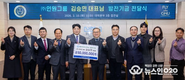 (뉴스인020 = 김성길 기자) 경상국립대학교는 2월 10일 오전 11시 대학본부 접견실에서 수의과대학 발전을 위한 ㈜인원그룹(대표 김승민) 기금 전달식을 개최했다.