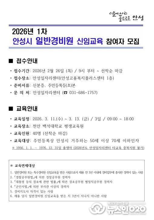 (뉴스인020 = 김성길 기자) 안성시는 관내 구직자의 안정적인 일자리 창출을 위해 오는 2월 26일부터 '2026년 제1차 안성시 일반경비원 신임 교육' 교육생을 모집한다고 밝혔다.