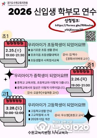 (뉴스인020 = 김성길 기자) 경기도수원교육지원청은 오는 2월 25일부터 28일까지 사흘간 관내 초‧중‧고등학교 입학을 앞둔 예비 신입생 학부모를 대상으로'2026년 신입생 학부모 연수'를 운영한다.