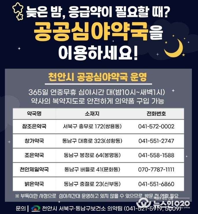 공공심야약국은 △참조은약국(쌍용동) △창가약국(성황동) △조은약국(봉명동) △천안제일약국(문화동) △밝은약국(신부동)이다.