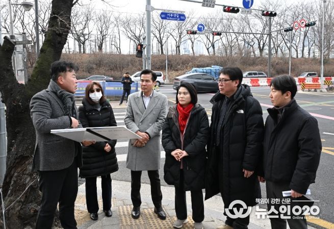 (뉴스인020 = 김성길 기자) 서울특별시의회 시민권익위원회 위원으로 활동하고 있는 박춘선 의원(강동3, 국민의힘)이 2월 10일 교통정체로 시민 불편이 지속되고 있는 가산한내보도육교 앞 교차로를 직접 찾아 현장 점검을 실시했다. 현장에는 서울특별시의회 현장민원과와 서부간선도로 주관 부서인 서울시 도로계획과, 도시기반시설본부 관계자가 함께 했다.