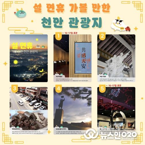(뉴스인020 = 김성길 기자) 천안시가 설 연휴를 맞아 역사와 문화, 미식을 한 번에 즐길 수 있는 ‘천안 대표 관광명소 연계 코스’를 추천한다고 12일 밝혔다.
