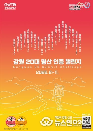 (뉴스인020 = 김성길 기자) 강원특별자치도와 강원관광재단은 오는 2월 23일부터 11월까지 ‘강원 20대 명산 인증챌린지’를 운영한다.
