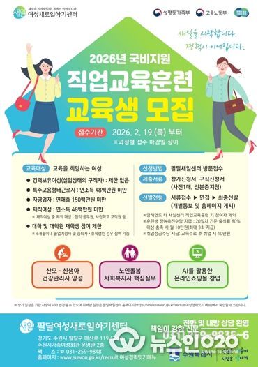 (뉴스인020 = 김성길 기자) 수원시 팔달여성새로일하기센터가 ‘2026년 직업교육훈련’ 교육생 60명을 2월 19일부터 모집한다.
