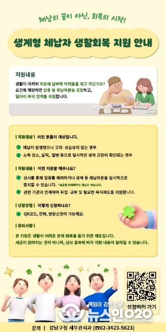 (뉴스인020 = 김성길 기자) 꿈이 보이는 도시, 미래를 그리는 강남구가 생계형 체납자 전담조직 ‘생활회복지원단’을 출범하고, 신청제 도입·통합실태조사·AI 관리대장 개발로 이어지는 전국 최초 3종 지원체계를 가동한다.