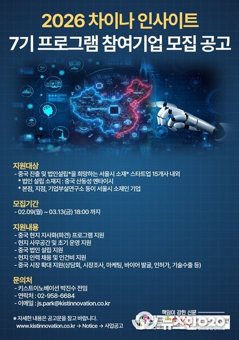 중국 프로그램은 “2026 차이나 인사이트 7기 프로그램”으로 스타트업플러스 플랫폼에 2월 9일부터 3월 13일까지 공고 및 접수 후 서류 및 발표평가를 통해 서울시 창업기업 15개사를 선정하여 4월부터 12월까지 관련 프로그램을 지원할 예정이다.