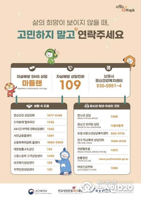 (뉴스인020 = 김성길 기자) 보령시는 자살률이 상대적으로 높아지는 봄철을 맞아 오는 2월 23일부터 3월 8일까지 2주간 자살 고위험시기 집중관리 기간을 운영한다.