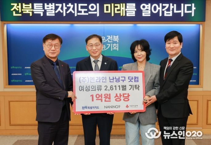 (뉴스인020 = 김성길 기자) 전북특별자치도는 20일 도청에서 ㈜엔라인이 운영하는 온라인 여성의류 쇼핑몰 ‘난닝구닷컴’의 의류 기탁식을 개최했다.