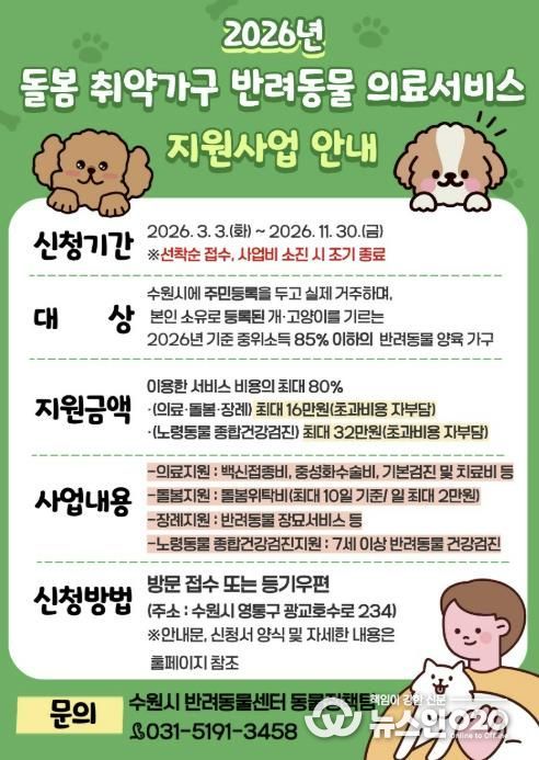 (뉴스인020 = 김성길 기자) 수원특례시는 돌봄 취약가구의 반려동물 양육 부담을 덜고 동물복지를 강화하기 위해 ‘2026년 돌봄 취약가구 반려동물 의료서비스 지원사업’을 추진한다.