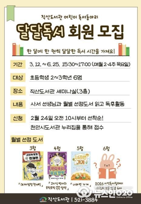 (뉴스인020 = 김성길 기자) 천안시 직산도서관은 상반기 어린이 독서동아리 ‘달달독서’ 참여자를 모집한다고 23일 밝혔다.