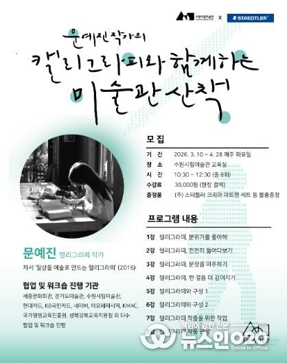 (뉴스인020 = 김성길 기자) 수원시립미술관은 독일 문구 기업 ㈜스테들러 코리아와 공동으로 '캘리그라피와 함께하는 미술관 산책'을 3월 10일부터 4월 28일까지 운영하며 참가자를 모집한다.