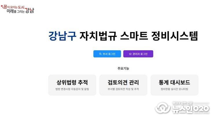 (뉴스인020 = 김성길 기자) 꿈이 모이는 도시, 미래를 그리는 강남구가 상위법 개정 사항을 신속하게 반영하기 위해 인공지능(AI)을 활용한 ‘자치법규 스마트 정비시스템’을 자체 구축했다.