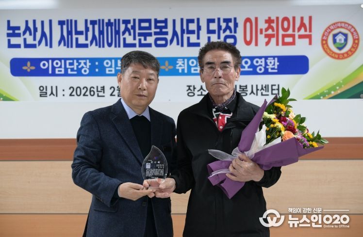 (뉴스인020 = 김성길 기자) 논산시재난재해전문봉사단은 지난 22일 논산시자원봉사센터에서 제3대 오영환 단장 취임과 제1·2대 임부산 단장의 이임을 기념하는 이·취임식을 개최했다.