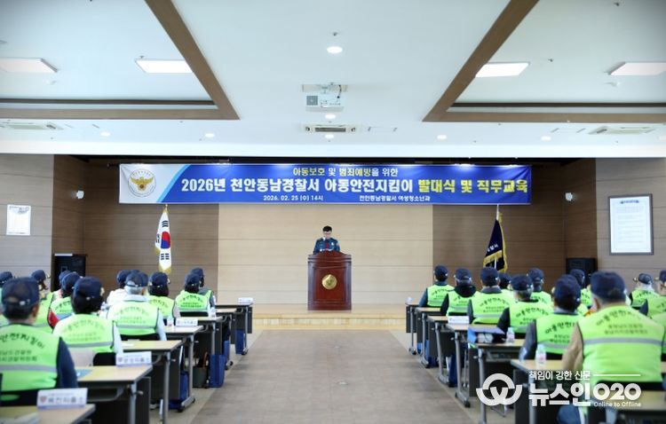 (뉴스인020 = 김성길 기자) 천안동남경찰서(서장 이민수)는 2026. 2. 25., 14:00경 천안동남경찰서 5층 대회의실에서 2026년 아동안전지킴이로 선발된 56명의 아동안전 지킴이들이 참석한 가운데 아동 보호 및 범죄 예방을 위한 '2026년 아동안전지킴이 발대식'을 개최했다.