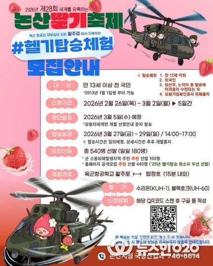 논산시가 오는 3월 개최되는 ‘제28회 논산딸기축제’의 백미(하이라이트)인‘헬기 탑승 체험’의 신청 접수를 시작한다고 전했다.