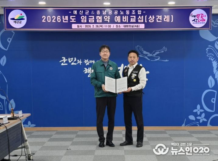 (뉴스인020 = 김성길 기자) 예산군은 지난 26일 군청 대회의실에서 충남공공노동조합과 ‘2026년 임금협상을 위한 예비교섭’을 개최하고 본격적인 노사 협상에 돌입했다고 밝혔다.