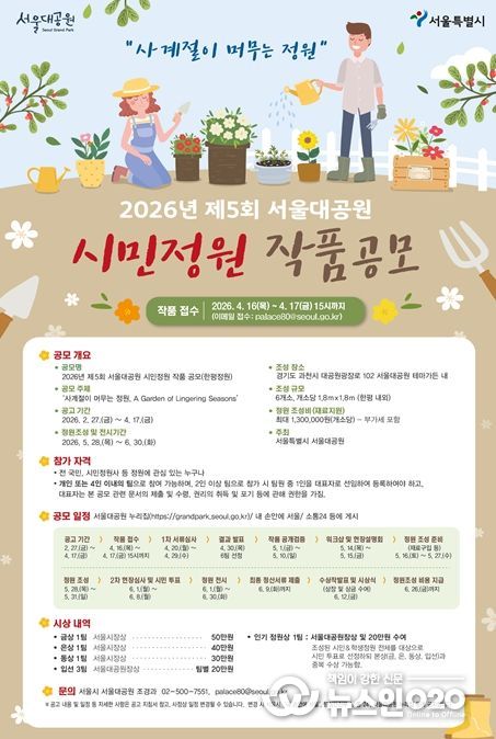 (뉴스인020 = 김성길 기자) 서울대공원은 시민이 직접 정원을 설계하고 가꾸며 정원문화를 확산하는 ‘2026년 제5회 시민참여정원 작품 공모전’을 개최한다.
