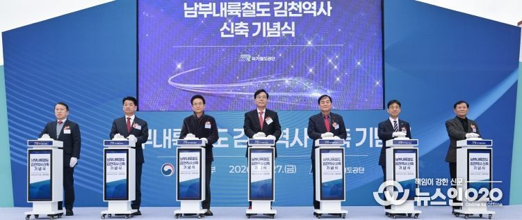 (뉴스인020 = 김성길 기자) 김천역 광장에서 27일 남부내륙철도‘김천역 선상역사 신축 기념식’이 열렸다. 이날 행사에는 이철우 도지사, 송언석 국회의원, 배낙호 시장, 경북도의회 지역 도의원과 주민 등 150여 명이 참석했다.