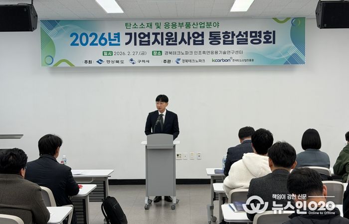 (뉴스인020 = 김성길 기자) 경상북도는 27일 구미시 산동읍에 위치한 경북테크노파크 인조흑연응용기술연구센터에서 도내 기업 및 유관기관 관계자 50여 명이 참석한 가운데 '2026년 탄소산업 기업지원사업 통합설명회'를 개최했다.