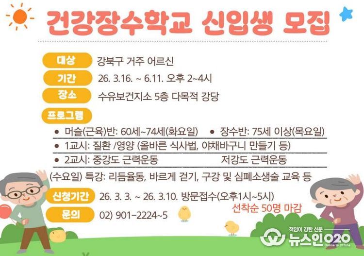 (뉴스인020 = 김성길 기자) 서울 강북구는 어르신들의 활기찬 노후 생활을 지원하고 만성질환 예방을 돕기 위해 오는 16일부터 ‘건강장수학교’를 운영한다고 밝혔다.