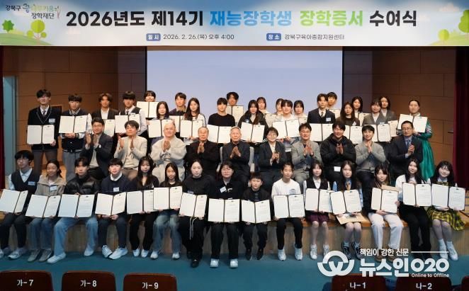 (뉴스인020 = 김성길 기자) 서울 강북구는 지난 2월 26일 강북구육아종합지원센터 공연장에서 강북구 꿈나무키움 장학재단 제14기 재능장학증서 수여식을 개최했다고 밝혔다.