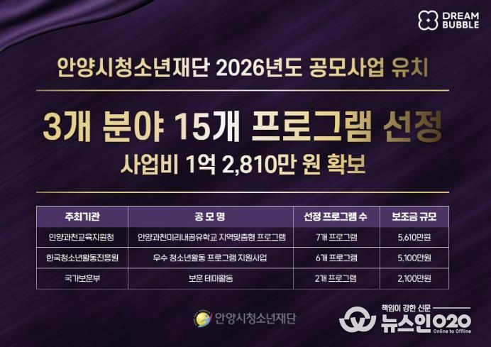 (뉴스인020 = 김성길 기자) 안양시청소년재단은 2026년 국가 및 공공기관, 교육청 등이 추진하는 주요 공모사업 3개 분야에서 15개 프로그램이 선정되어 총 1억 2,810만 원 규모의 사업비를 확보했다고 3일 밝혔다.