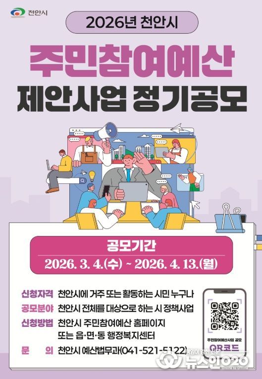 (뉴스인020 = 김성길 기자) 천안시가 시민이 직접 예산 편성 과정에 참여하는 ‘2026년 주민참여예산 제안사업 정기공모’를 실시한다.