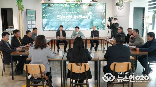 현장 방문에 이어 스타트업베이에서 열린 주민 간담회에는 송산·정방·중앙·천지동 등 4개 동 주민 대표 12명이 참석해 원도심 활성화 방안을 논의했다.