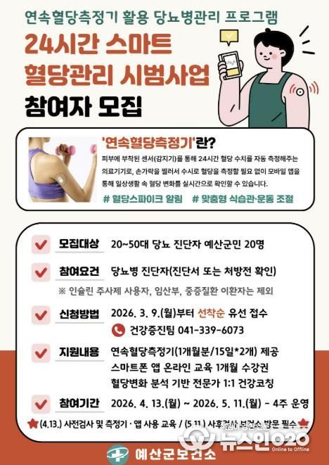 (뉴스인020 = 김성길 기자) 예산군보건소는 오는 3월 9일부터 ‘24시간 스마트 혈당관리 시범사업’ 참여자 20명을 선착순 모집한다.