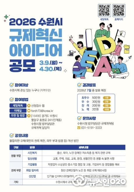 (뉴스인020 = 김성길 기자) 수원특례시가 9일부터 4월 30일까지 ‘2026 규제혁신 아이디어’를 공모한다.