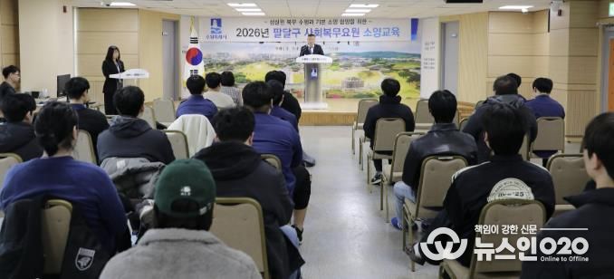 (뉴스인020 = 김성길 기자) 수원시 팔달구는 지난 5일 팔달구청 대회의실에서 사회복무요원 전원을 대상으로 2026년 상반기 소양교육을 실시했다.