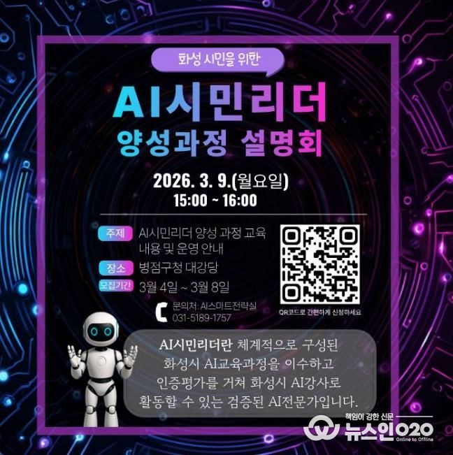 (뉴스인020 = 김성길 기자) 화성특례시는 시민이 학습하고 교육하는 인공지능(AI) 학습 체계 구축을 위해 ‘2026년 AI시민리더 양성 교육’ 설명회를 3월 9일 오후 3시에 병점구청 대강당에서 개최한다.
