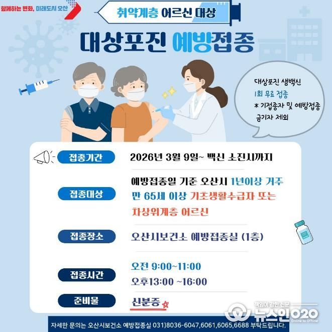(뉴스인020 = 김성길 기자) 오산시보건소는 오는 3월 9일부터 백신 소진 시까지 관내 65세 이상 취약계층 어르신을 대상으로 대상포진 무료 예방접종을 시행한다고 밝혔다.