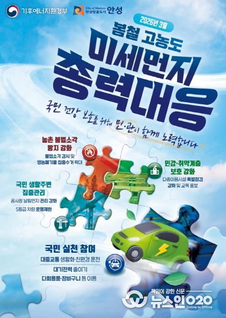 (뉴스인020 = 김성길 기자) 안성시는 고농도 미세먼지 발생이 빈번한 봄철을 맞아 시민 건강 보호를 위해 3월 한달 간 ‘초미세먼지 봄철 총력대응’을 추진한다고 밝혔다.