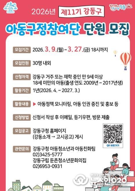 (뉴스인020 = 김성길 기자) 서울 강동구는 3월 9일부터 27일까지 아동정책 모니터링과 아동 권리 증진 활동을 이끌어갈 ‘제11기 강동구 아동구정참여단’을 모집한다고 9일 밝혔다.