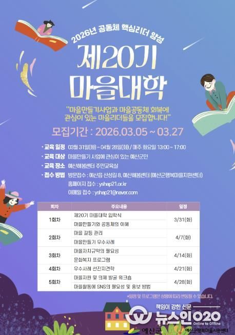 (뉴스인020 = 김성길 기자) 예산군행복마을지원센터는 주민이 주도하는 마을만들기 사업을 이끌 핵심 인재를 양성하기 위해 ‘제20기 마을대학’ 수강생을 3월 27일까지 모집한다고 밝혔다.