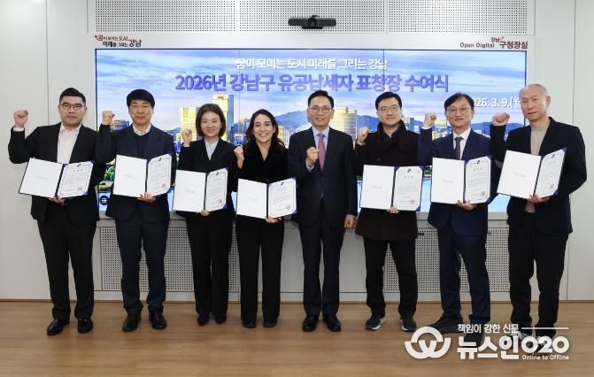 (뉴스인020 = 김성길 기자) 꿈이 모이는 도시, 미래를 그리는 강남구가 9일 구청에서 ‘2026 유공납세자 표창장 수여식’을 개최하고, 성실납세로 지역사회에 기여한 유공납세자 10명에게 표창장을 수여했다. 올해 유공납세자는 개인 5명, 법인 5개사로, 이 가운데 가수 겸 배우로 활동 중인 권유리(소녀시대 유리) 씨도 포함됐다.