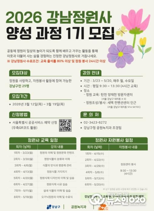 (뉴스인020 = 김성길 기자) 꿈이 모이는 도시, 미래를 그리는 강남구가 생활권 공원과 녹지 관리 수요 증가에 대응해 전문성을 갖춘 시민 인력을 양성하는 ‘강남정원사 양성 교육 1기 프로그램’을 운영한다. 교육은 3월 23일부터 5월 20일까지 양재천과 세텍 일대에서 진행된다.