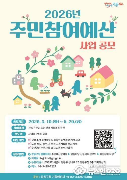 (뉴스인020 = 김성길 기자) 서울 강동구는 내년도 예산 편성에 반영할 주민제안사업을 올해 3월 10일부터 5월 29일까지 공모한다고 밝혔다.