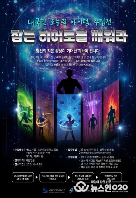 (뉴스인020 = 김나현 기자) 미래의 꿈을 만드는 과학 기술 문화 이음터(플랫폼) 과학기술정보통신부 국립중앙과학관은 창의 나래관 신규 전시관 개관을 앞두고, 대국민 참여형 전시인 ‘초능력 품목(아이템) 수집전: 잠든 영웅(히어로)을 깨워라’를 3월 10일부터 시작한다고 밝혔다.