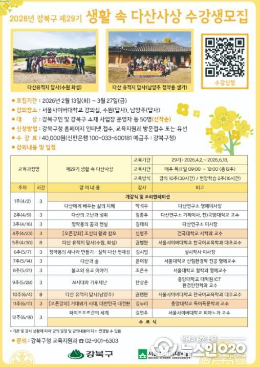 (뉴스인020 = 김성길 기자) 서울 강북구는 다산 정약용의 사상과 인문학적 가치를 생활 속에서 쉽게 접할 수 있도록 '제29기 생활 속 다산사상' 수강생을 모집한다고 밝혔다.