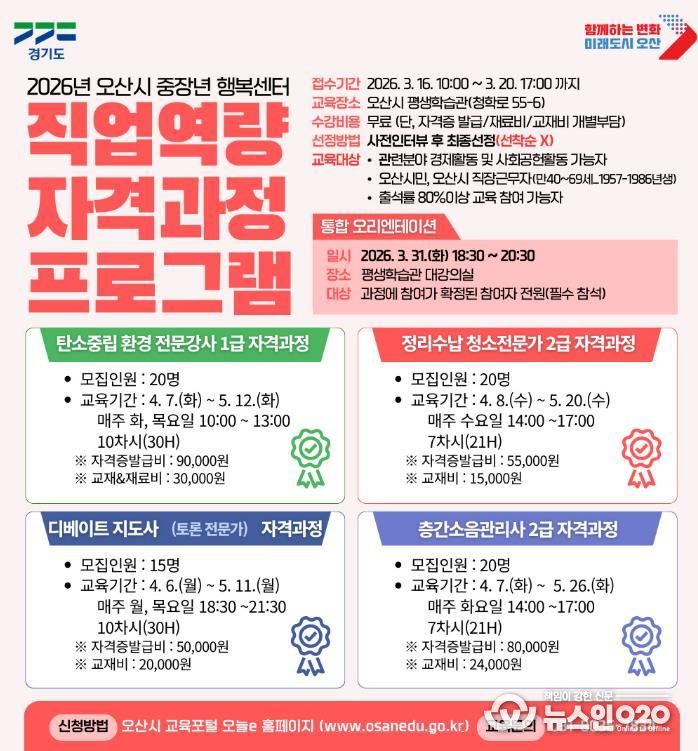 (뉴스인020 = 김성길 기자) 오산시는 중장년층의 경제활동 참여 확대와 사회공헌 기회 제공을 위해 ‘2026년 오산시 중장년 행복센터 직업역량 자격과정 프로그램’ 수강생을 모집한다고 밝혔다.