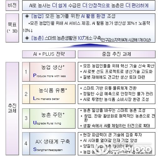 (뉴스인020 = 김나현 기자) 농림축산식품부는 3월 11일 개최된 제5회 과학기술관계장관회의에서 관계부처 합동으로 수립한'농업·농촌 인공지능 대전환(AX) 전략'을 발표했다고 밝혔다. 이번 전략은 농업과 농촌에 인공지능(AI)을 접목하여 보다 경쟁력 있는 농산업 생태계를 조성하고, 농촌 주민의 삶의 질을 높이는 데 중점을 두었다.